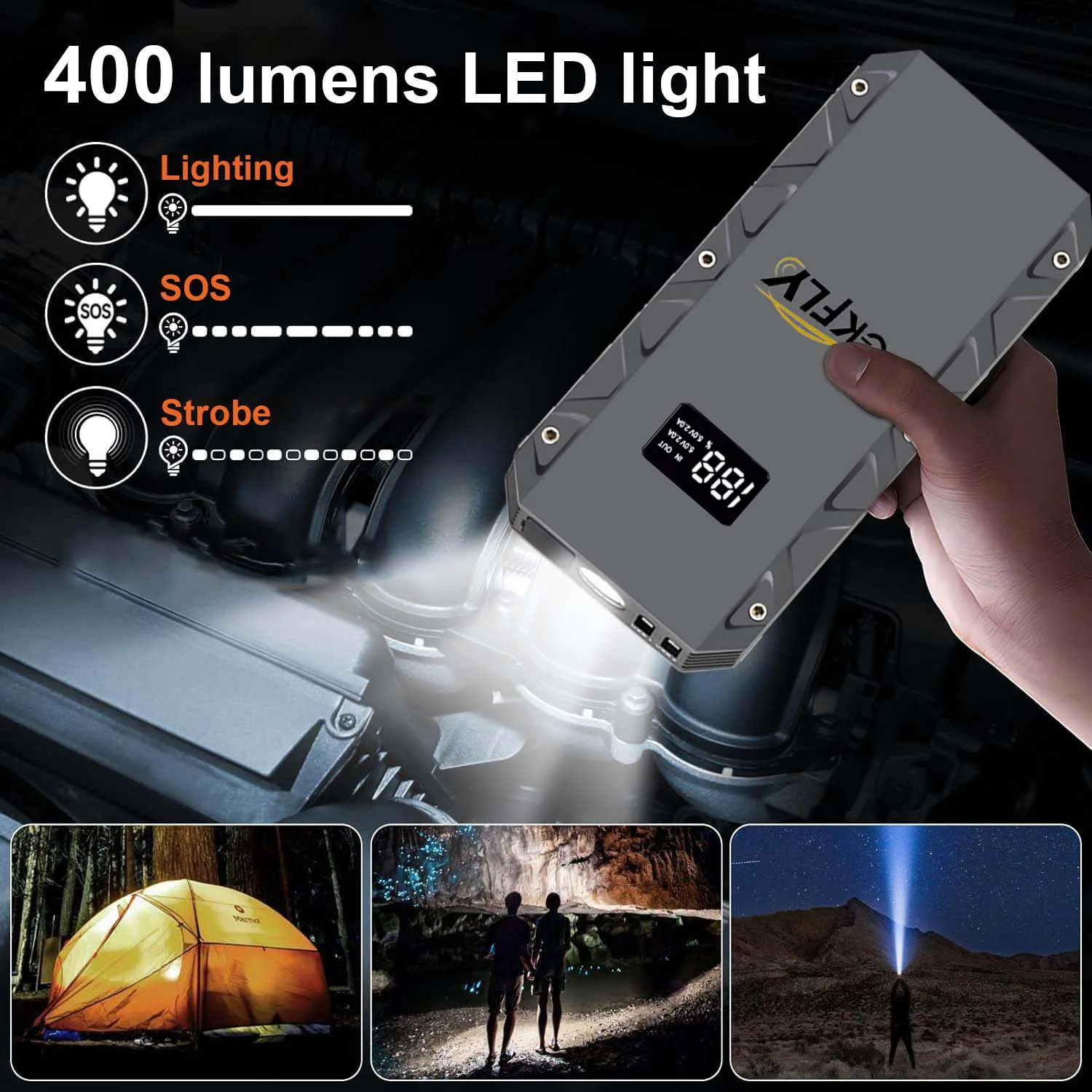 Product GalleryProduct SpecificationsHigh-concerned chemicalNonePeak Current>1200 ACertifiedFCC,ce,SDSSpecial FeaturesSOS Lighting,Lighting,USBItem We
